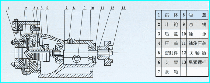 4、机械密封:采用WB2型、ST型不用冷却水可调式单端面机械密封技术,由碳化硅、高纯度氧化铝陶瓷、填充四氟、石墨等材料制成。