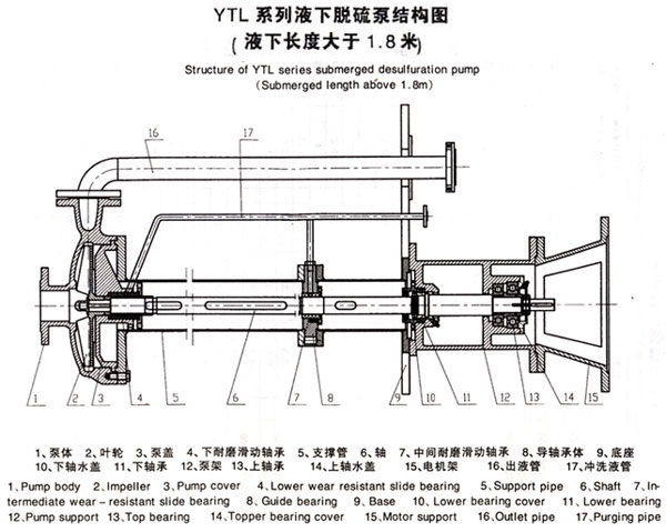 YTL系列液下脱硫泵,当泵的液下长度大于1.8米时,该泵为立式长轴液下离心泵,液下部分设有耐磨、耐腐蚀滑动轴承;该结构泵由泵体、叶轮、泵盖、下耐磨滑动轴承、中间磨滑动轴承、支撑管、泵架、轴等部件组成。